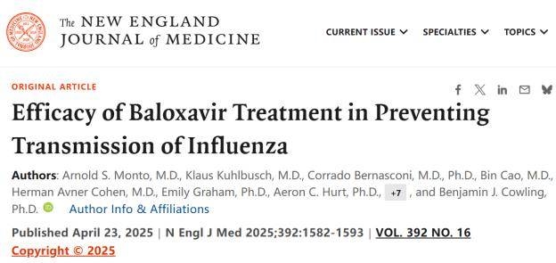 2025年4月25日,罗氏全球宣布,速福达玛巴洛沙韦III期临床试验CENTERSTONE研究详细结果在《新英格兰医学杂志》(NEJM)上发布。结果显示研究达到了主要终点:流感感染者单次口服速福达玛巴洛沙韦后,其未接受治疗的家庭成员感染病毒的概率降低了32%。
